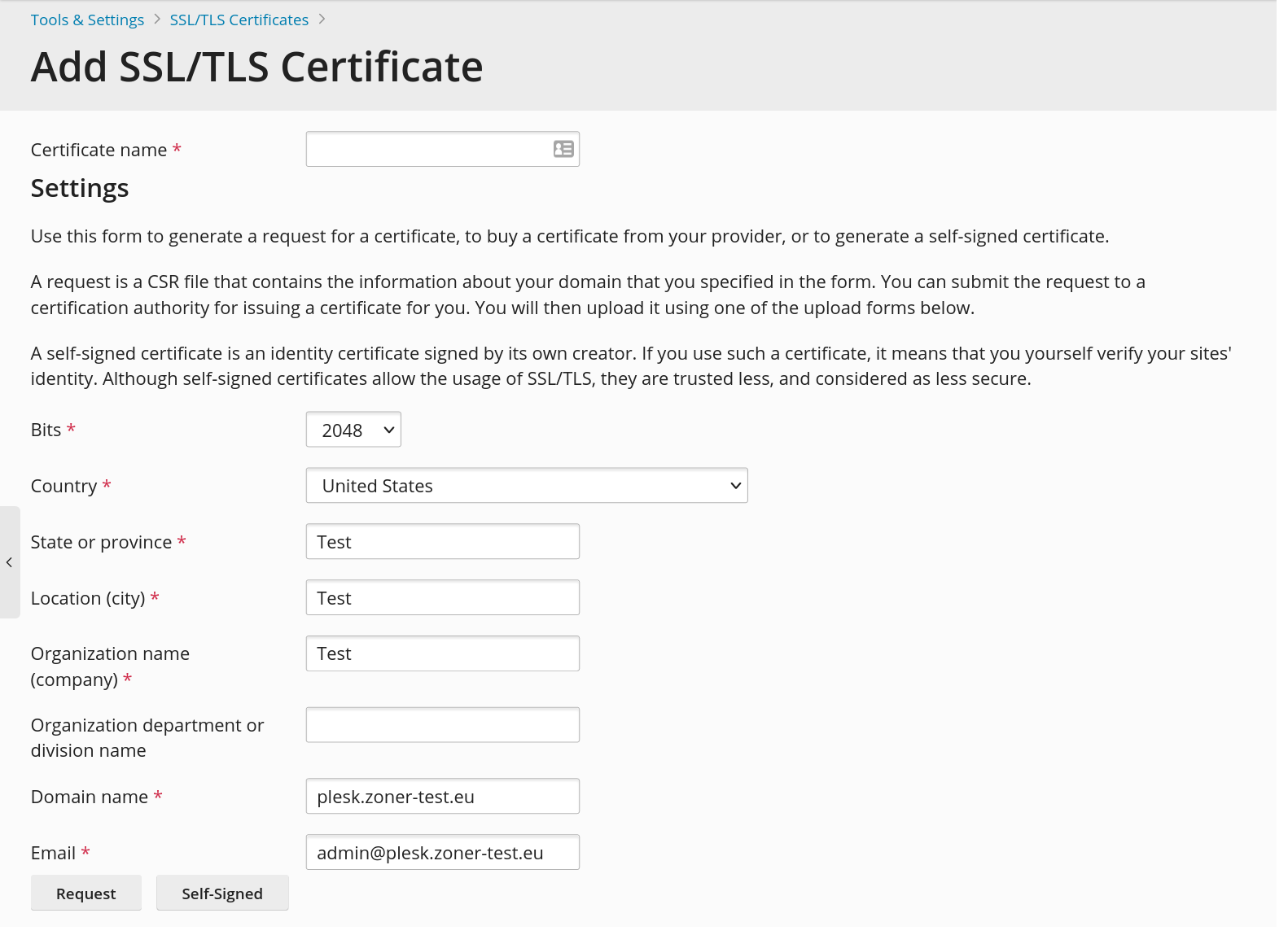 Die zweite Lösung ist eine Zertifikatsanforderung zu erstellen, die als CSR genannt wird, und diese in der Zertifikatsbestellung im SSLmarket zu nutzen. Füllen Sie den Namen des Zertifikats (am besten benennen Sie es nach der Domain und dem Jahr des Ablaufs) und alle weiteren erforderlichen Angaben aus. Nachdem alle Pflichtfelder ausgefüllt sind, klicken Sie den Button Request an und der CSR-Code wird erstellt.